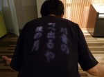 そこで、千代女の俳句を背中に写してみました! これは、ライトに照らされた俳句がフロアーに写るようになっていたのを、そこへ僕が背中から入っていってゲットした絵です。オモロイかな・・・それとも不謹慎!? ごめん。