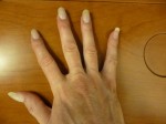 ころっと変わって、次はダグの右手の画像。彼はサムピックを使うのですが、それでも、親指の爪から順に4本、ネイルサロンでやってもらうそうです。ひと指$3だそうですよ。小指の爪は自爪。