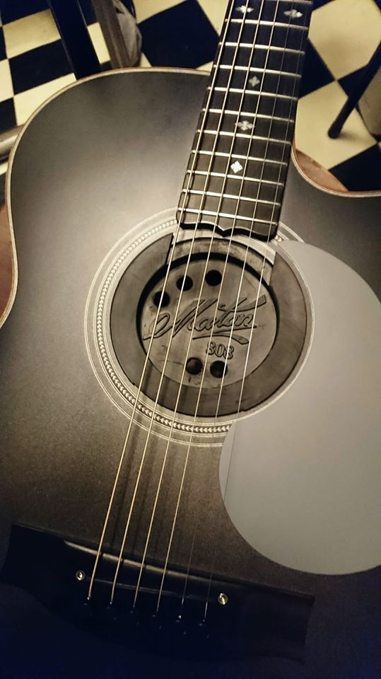 で、画像のニューギターですが、さらに弦高を下げてもらって、その上、フィードバックバスター(サウンドホールのところの黒いゴム状のもの)に5か所穴をあけてもらいました。その理由は、穴がないものだと、ピエゾの音が強調された感じになり、しかもリミッターでもかかったような音色になるんですよね。ですが、フィードバックを防ぐには穴無しがベターです・・・で、穴をあけると、その分、音が息ができると言うか、エアー感が戻りますし、低域の感じもよくなります。穴アリ、穴ナシのものを比べながら作業していただきました。江坂・ドルフインギターズの木曽くんにお世話になりました。サンキュー~!