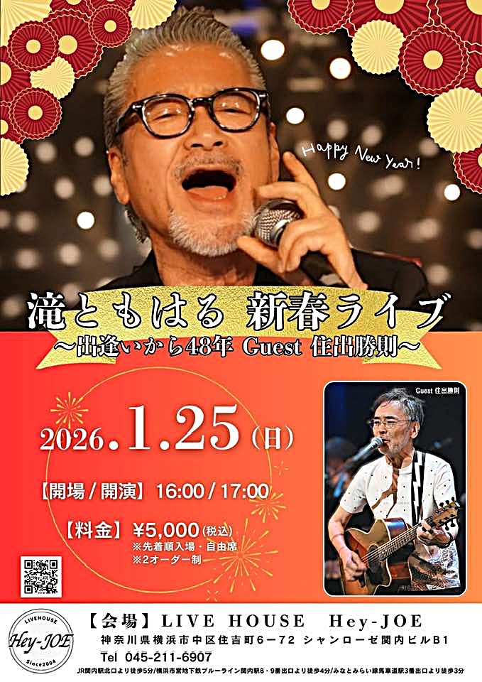1/25(日)、僕がゲスト出演する『滝ともはる 2026 新春ライブ 〜出逢いから48年~』の予約受付が始まっていますので、興味のある方は以下のページからお申し込みください!ひと手間おかけしますが、最初に登録が必要になりますので、ページ右側に青字で書いてある「初めての方のご利用ガイド」をご一読いただいてからご予約ください。どうぞ、よろしくお願いいたします!