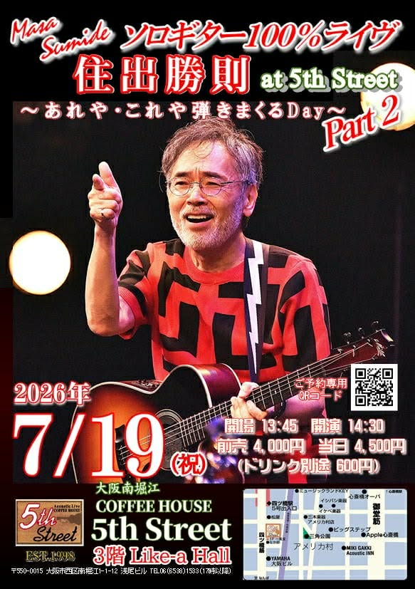 皆さま、7/19(日)at 5th Street(大阪・南堀江)での『ソロギター100%ライヴ』の予約が始まりましたので、お知らせしておきますね。ぜひ、お誘いあわせの上、ご来場ください!お待ちしております!
